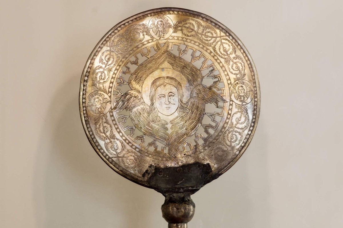 Icon mounted on wood with an image of seraphim (six-winged creatures of God in Christianity) used in church ceremonies, part of the glazed pot, rings, earrings, beads and knives.