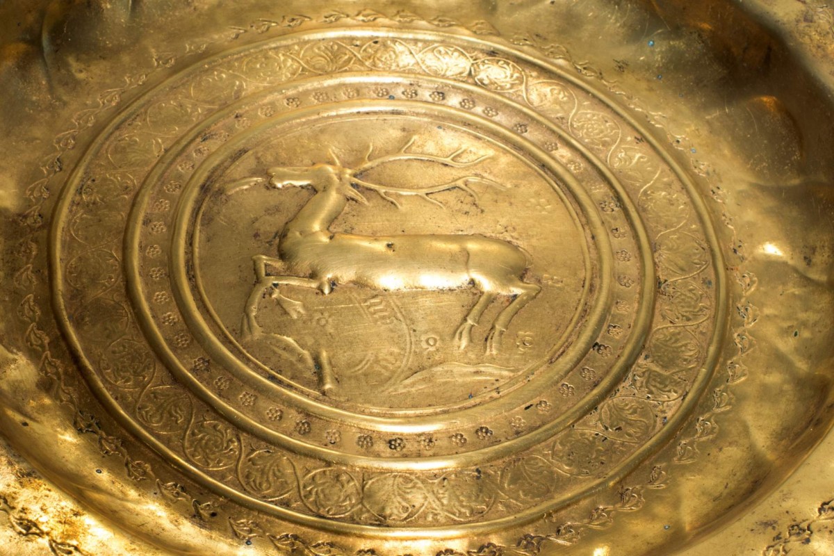 A brass plate with an image of a deer, stone hammer and ceramic fragments.