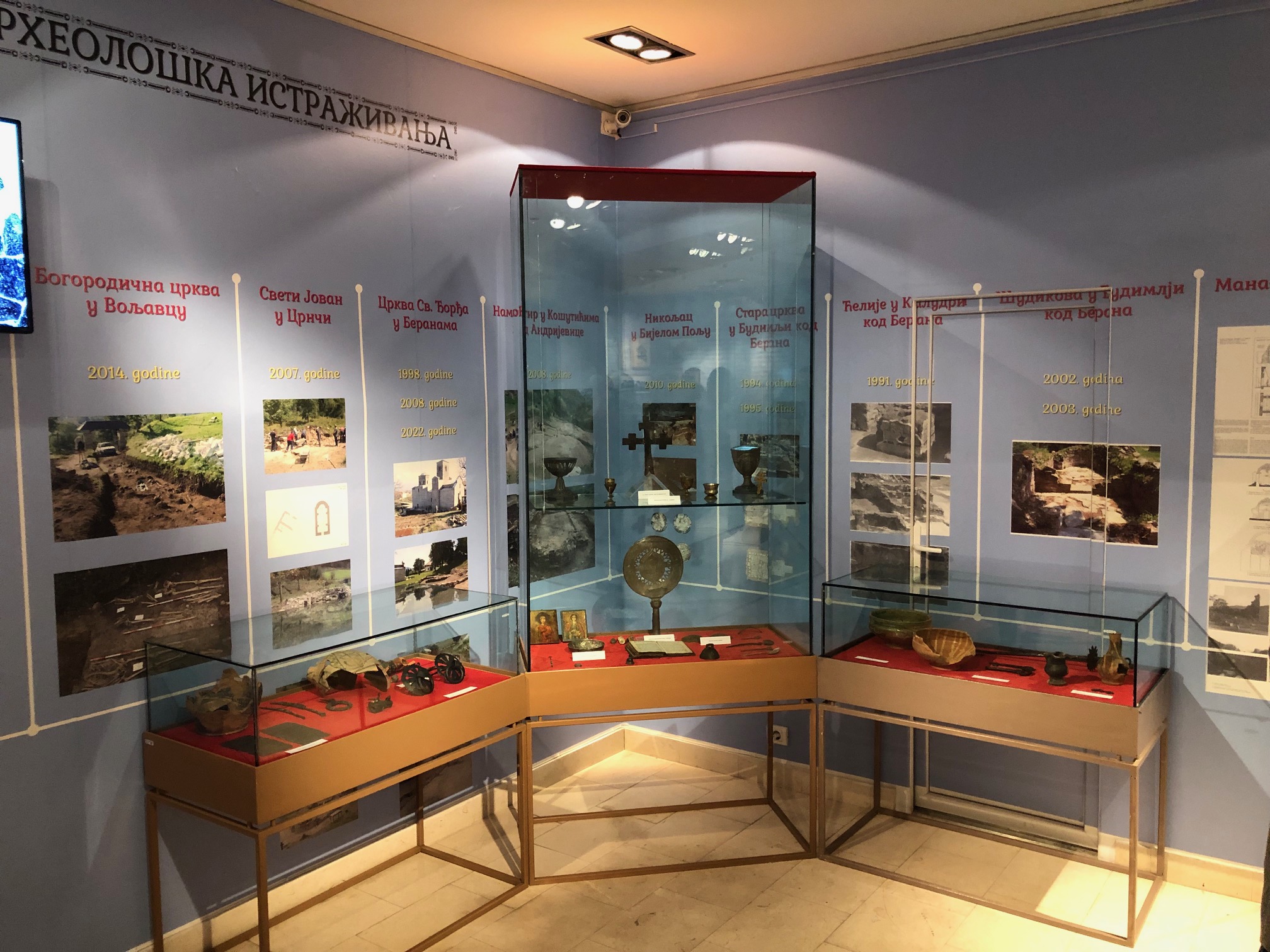 Posjetioci su imali priliku da vide više od osam vjekova arhitektonskog, umjetničkog i duhovnog razvoja šireg geografskog područja, poznatog pod nazivom Polimlje. Izložba prikazuje arhitekturu, srednjevjekovno zidno slikarstvo, ikone i knjige dvanaest srednjevjekovnih crkava i manastira nastalih u nemanjićkom periodu (i kasnijem) – manastirski kompleks Namastir u Košutićima kod Andrijevice, manastiraki kompleks Ćelije u Kaludri kod Berana, Stara crkva na groblju u Budimlji kod Berana, manastir Šudikova u Budimlji kod Berana, manastiraki kompleks Uroševica, manastirski kompleks Djurdjevi stupovi kod Berana, crkva Svetog Janje u Lubnicama kod Berana, manastirski kompleks u Majstorovinama kod Bijelog Polja, crkvu Svetog Petra i Pavla u Bijelom Polju, crkva Svetog Nikole u Nikoljcu kod Bijelog Polja, Voljevcu i Podvrhu kod Bijelog Polja.