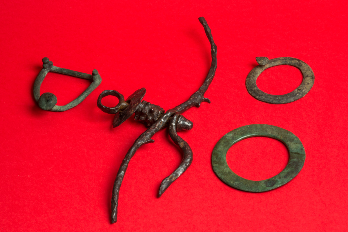 Vitrina 13Nalazi iz konjaničkog groba (najvjerovatnije je riječ o grobu avarskog ratnika, jer su oni sahranjivani s konjima): djelovi konjske opreme i pređica za kaiš. Rudeš (slučajni nalaz), 6. vijek n.e.